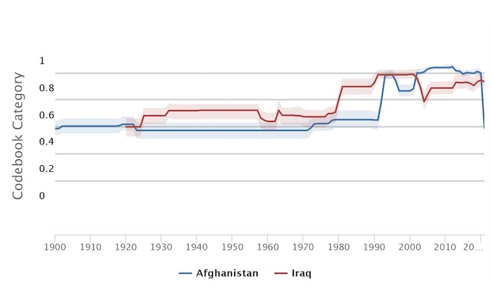 The V-Dem Institute, headquartered at the University of Gothenburg in Sweden, has produced the following datasets on religious freedom, political corruption, and women’s civil liberties in Iraq and Afghanistan– three dimensions of democracy that spotlight progressive stages of Iraq’s transformation from Saddam Hussein’s Ba’athist rule to its religious coalition government today, and of the bloody conflict between Afghanistan’s central government and the Taliban insurgency.