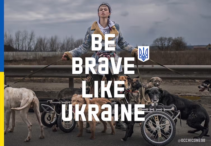 In the following months, Banda produced numerous messages in formats ranging from billboards, posters, and online videos, to social media posts, T-shirts, and stickers. A campaign website offers downloadable logos and photographs and asks visitors to share the message of bravery and donate to Ukraine.